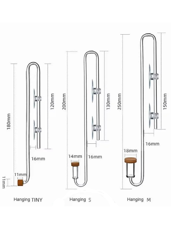 Aquapro CO2 difüzörü farklı hacimlerdeki akvaryumlar için farklı boyutlarda sunulmaktadır. Bu boyut seçenekleri, tank boyutuna göre esneklik sunar.